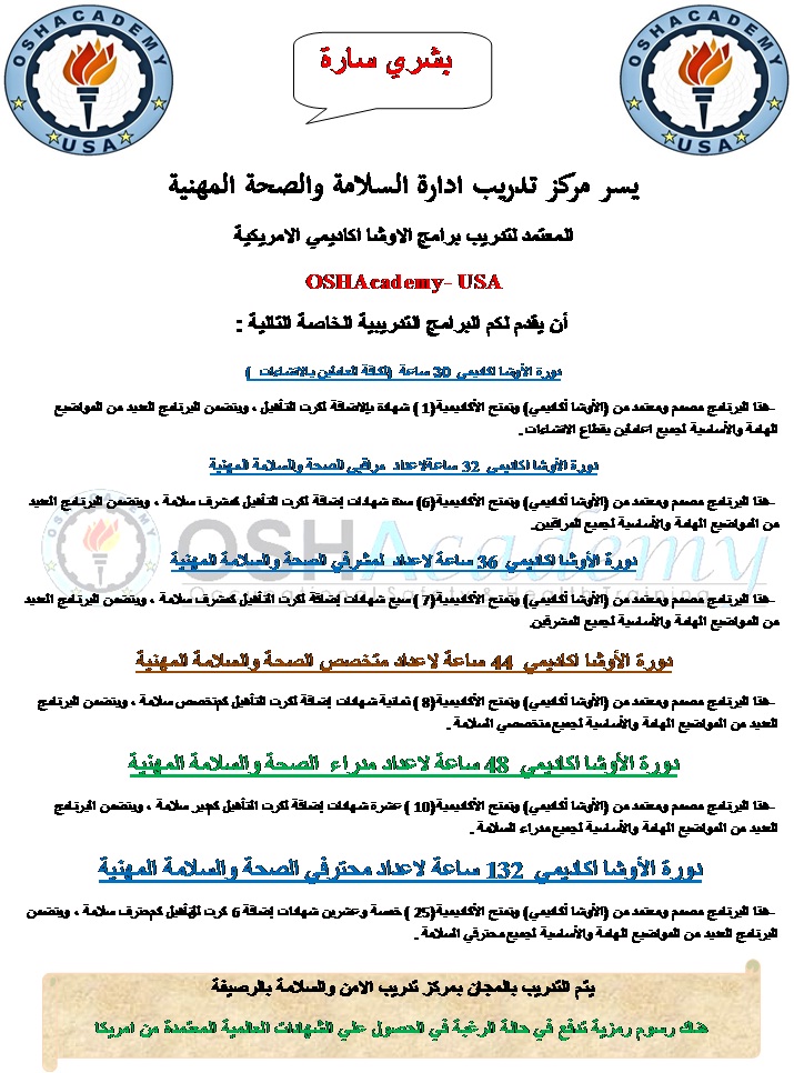بشرى سارة (مركز تدريب الامن والسلامة معتمد لتدريب برامج الاوشا اكاديمى الامريكية